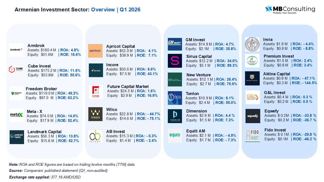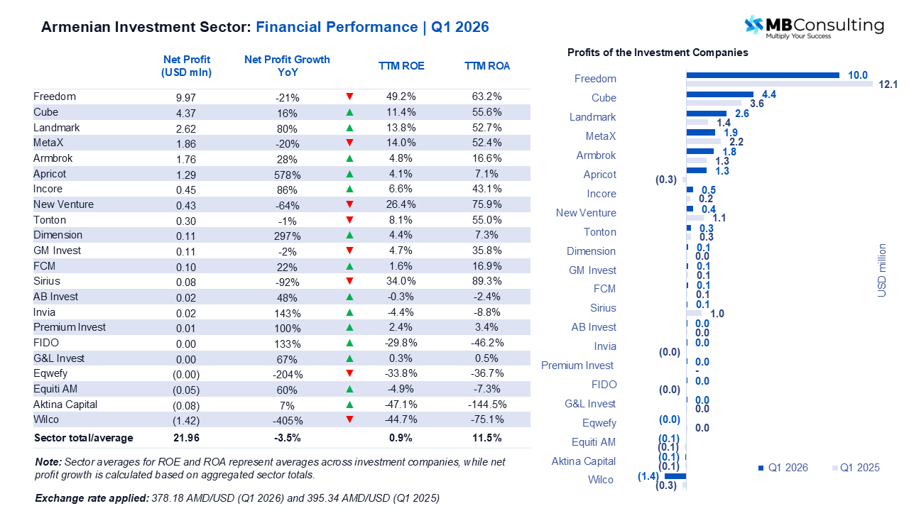 Freedom Broker Armenia remains the most profitable player, generating nearly USD 10 million in net profit in Q1 2026, though earnings declined YoY despite very high returns.