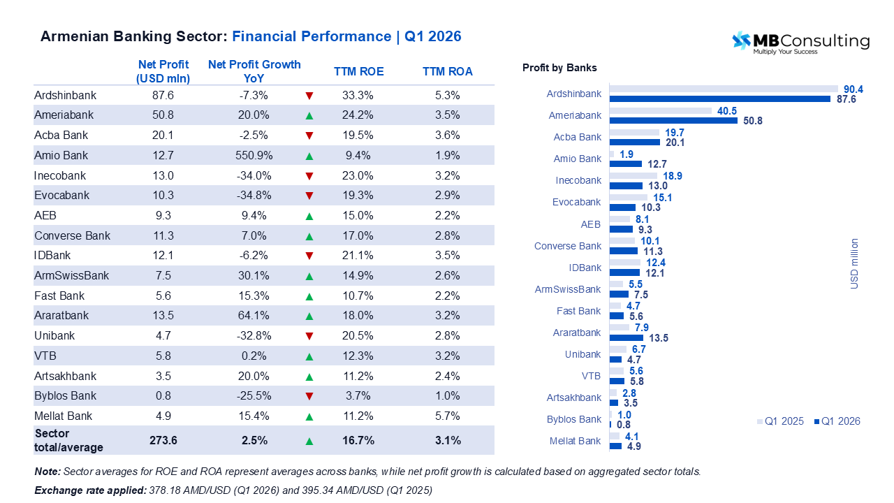 ROA and ROE figures are based on trailing twelve months (TTM) data. Net profit comparisons use Q1 2026 versus Q1 2025 for the year-over-year growth calculation. Sources: Banks' published quarterly statements (Q1 2026, non-audited). Exchange rates applied: 377.16 AMD/USD for current-period figures, 378.18 AMD/USD for Q1 2026 net profit, and 395.34 AMD/USD for Q1 2025 net profit comparisons. Sector averages for ROE and ROA represent averages across the 17 banks; sector growth metrics for assets, equity, and net profit are calculated on aggregated totals.