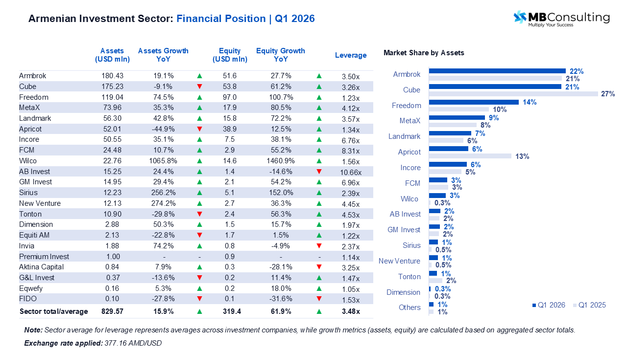 MB Consulting's Q1 2026 review of the Armenian investment company sector covers 22 institutions across asset size, capitalization, profitability, and growth, providing a structured snapshot of a sector that grew aggregate assets to USD 829.6 million while displaying significant performance dispersion among participants.