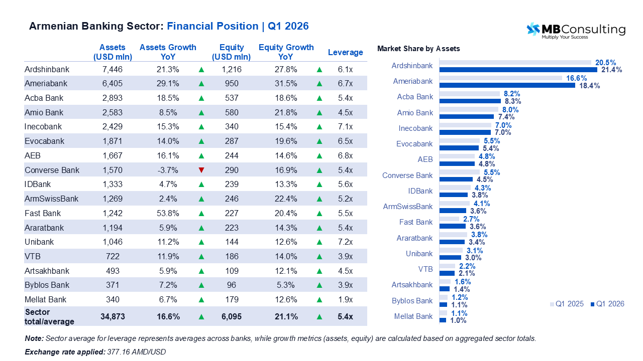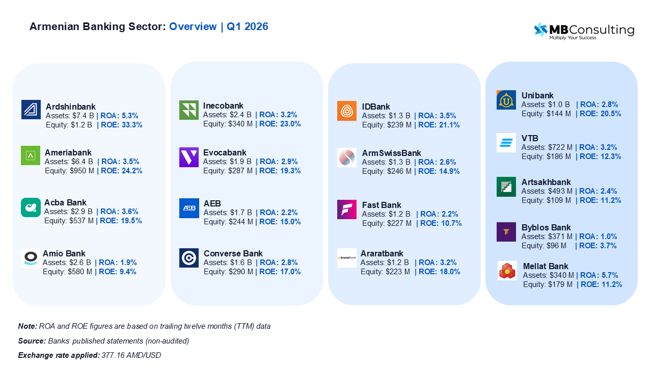 Across 17 banks, balance sheets are expanding at a double-digit pace while reported profits are flattening. MB Consulting's Q1 2026 review of the Armenian banking sector covers the full set of institutions, examining asset growth, capitalization, profitability, and the divergence between balance sheet expansion and bottom-line performance.